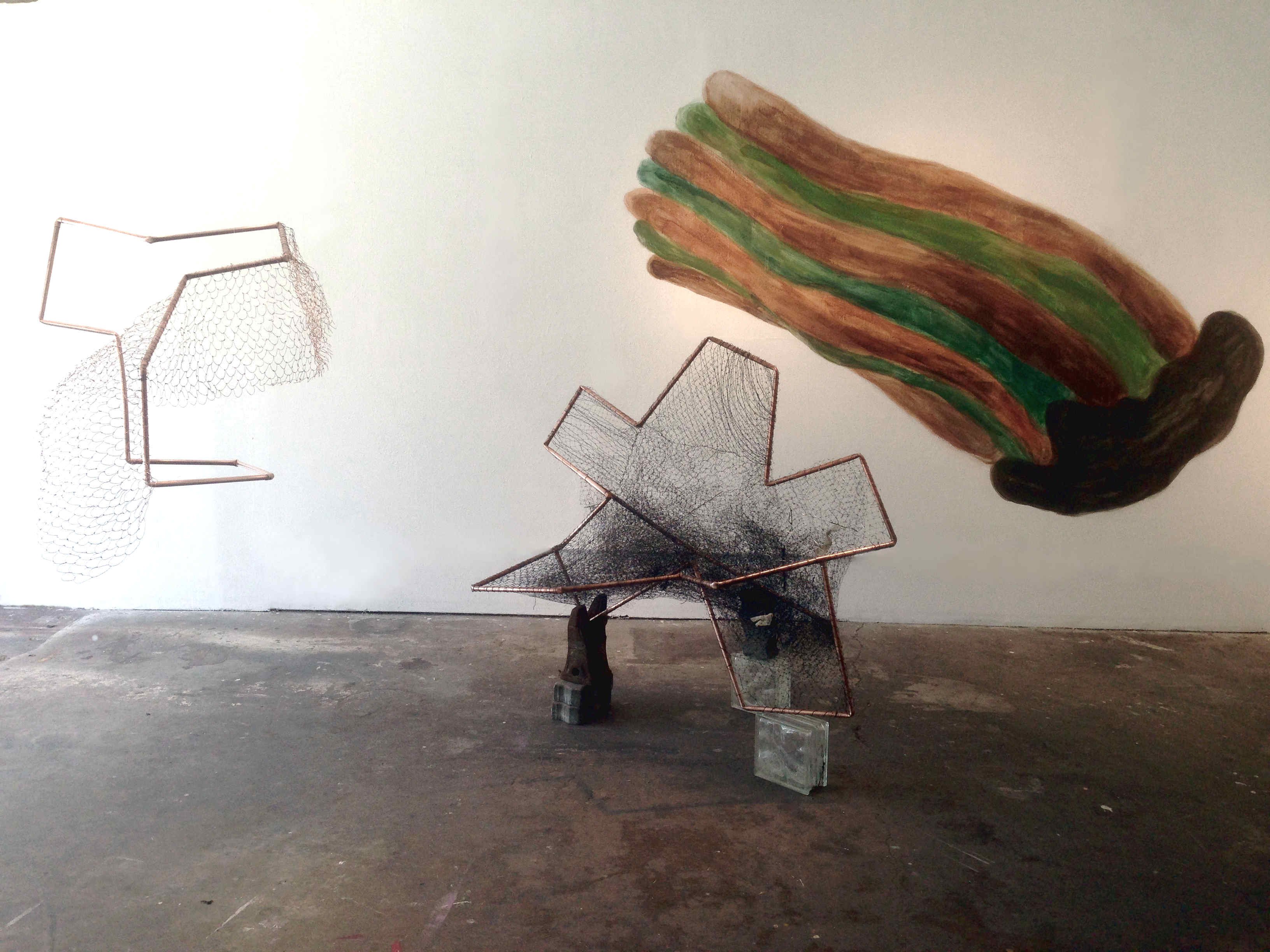 Piece of Soul Left 2019, copper pipes, fishing mesh, glass, ceramics, mixed media, installation at The Ministry of Casual Living gallery, Victoria, CA